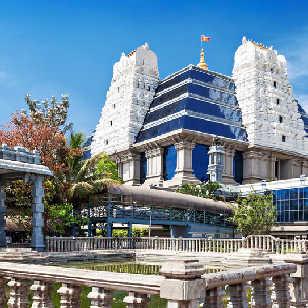 The main sanctum of the ISKCON Temple in Karnataka is adorned with a magnificent gold-plated flagpost and a gleaming gold-plated Kalash Shikhara atop its temple tower, adding to its grandeur. Known as the largest ISKCON temple in India, it is celebrated for its remarkable architecture, which combines modern design with traditional elements, making it both a spiritual haven and a visual masterpiece.